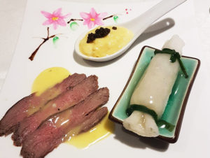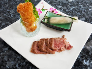 Pan-fried Hida Beef. Deep-fried Prawns with Mango. Braised Carrot with Asparagus filled in Bamboo Pith.