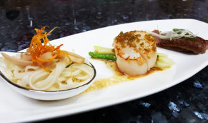Inaniwa udon with sliced Abalone. Pan-seared scallop with a coriander reduction. Pan-fried Matsuzaka beef.